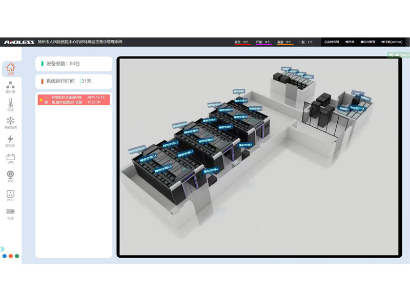 近期有幸為江蘇省某市檢察院提供三套安德力士品牌微模塊機(jī)房設(shè)備,涉及系統(tǒng)有:UPS不間斷電源、精密空調(diào)、機(jī)柜、配電、動(dòng)力環(huán)境監(jiān)控等系統(tǒng);涉及主要設(shè)備有:UPS主機(jī)(30KVA、40KVA、300KVA)、鉛酸蓄電池(100AH64節(jié)、200AH128節(jié)、250AH320節(jié))、精密空調(diào)(行級25KW12臺、基站12.5KW4臺)、機(jī)柜51套,現(xiàn)已全部安裝調(diào)試完成。